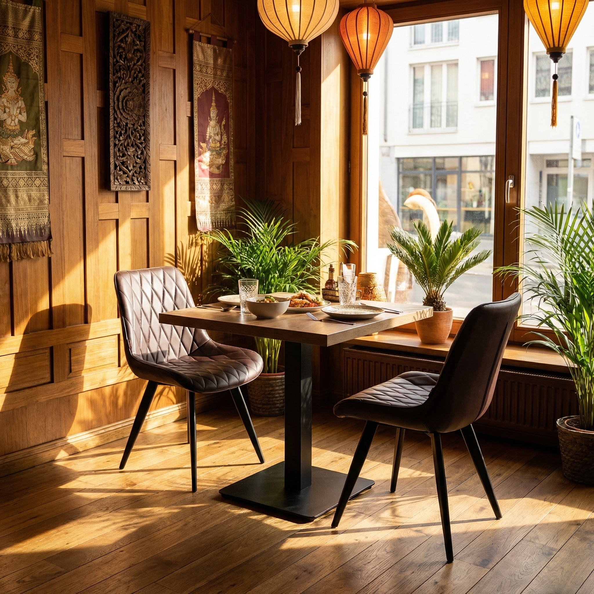 Restaurantsæt af høj kvalitet bestående af et Andora-egebord og 2 mørkebrune Scarlet-stole. Bordet har et ben af støbejern, og stolene kan skubbes ind under. Restaurantstol Scarlet og et sæde af imiteret læder i farven mørkebrun.