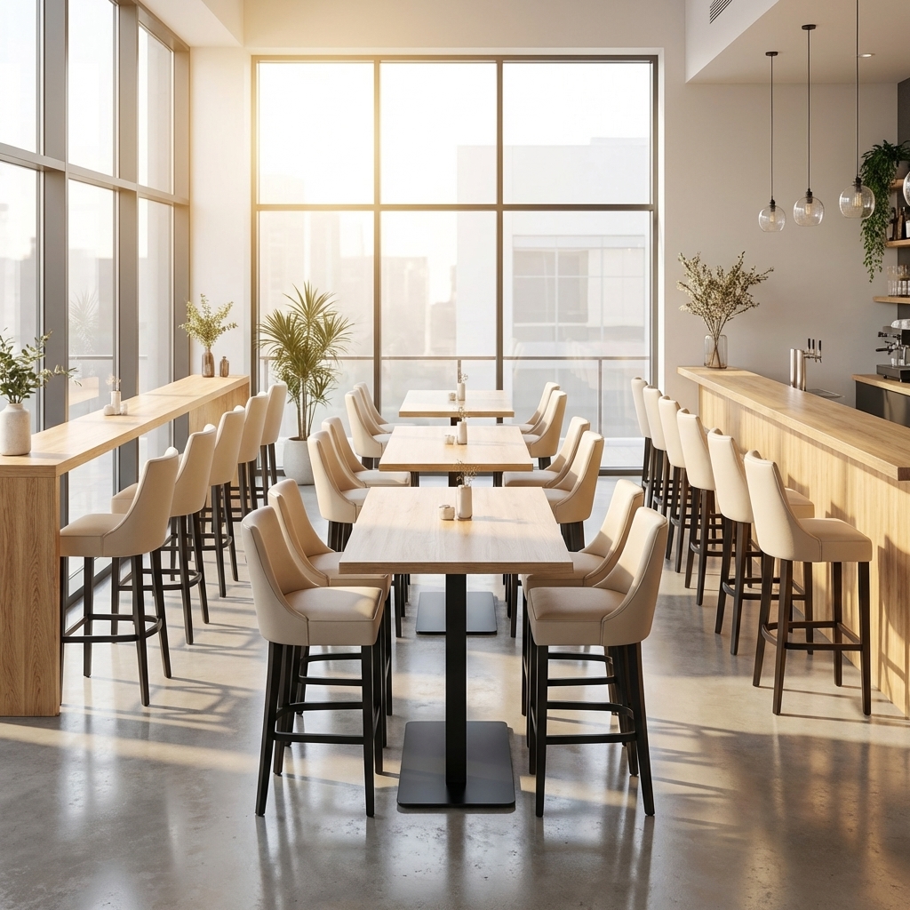 Barstol til restaurant Finja Polstret ryg og sæde lavet af imiteret læder i farven brun og har et let buet ryglæn