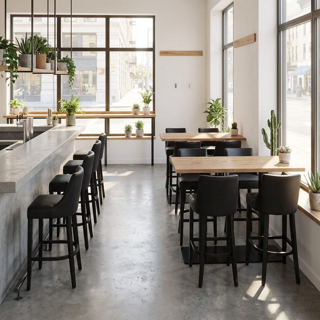 Barstol til restaurant Finja Polstret ryg og sæde lavet af imiteret læder i farven brun og har et let buet ryglæn